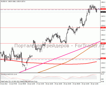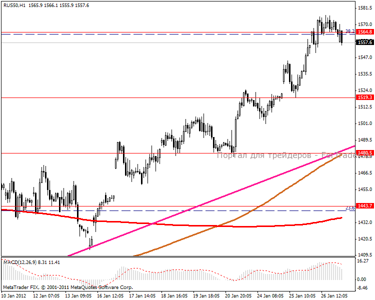 Часовой период показывает закрепление на сильной линии поддержки в 1564 пункта. Первая цель взята и вероятнее всего произойдет коррекция к центру канала 1519-1564 пункта в ближайшее время. MACD поддерживает закрепление.