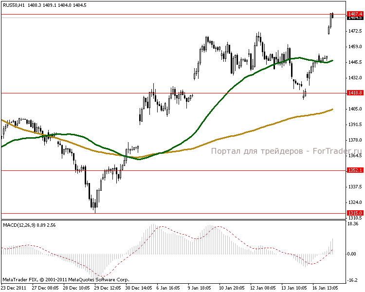 Часовой период показывает подход к главной краткосрочной цели в 1487 пунктов. Сегодня ожидаем закрепления на этом сильном уровне поддержки. Индекс не прекращает восходящих направлений и MACD поддерживает сильный рост.