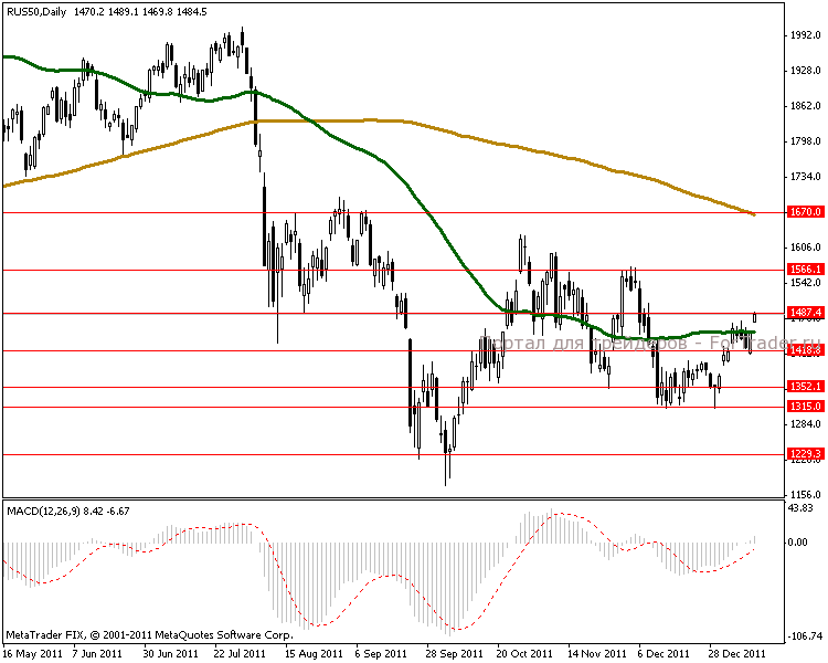 Дневной ценовой график говорит о следующих целях 1566 пунктов. Движение к следующей цели ожидаем не прямолинейным, поэтому краткосрочный боковик, привязанный к сильной линии поддержки в 1487 пунктов может сигнализировать о хорошем входе в рынок на покупку. MACD набирает оборот в положительной зоне, что свидетельствует о закреплении индекса на данных позициях..