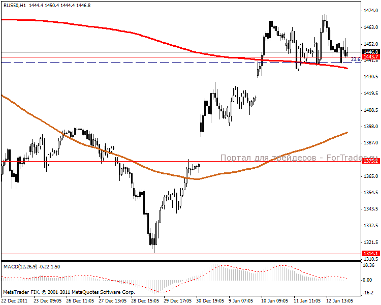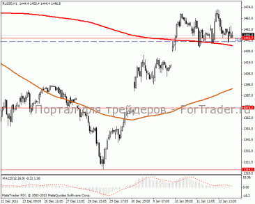 Часовой период показывает закрепление на линии поддержки в 1443 пункта. Просадок не ожидаем на данный момент. Сегодня вероятнее всего будет рост к 1470 пунктов. Коррекция трехволновки подошла к завершению, отыграла боковиком. Сложилась хорошая ситуация для рассмотрения на выбор позиции и входа в рынок по краткосрочной перспективе. MACD рисует продолжение боковика с незначительным снижением.