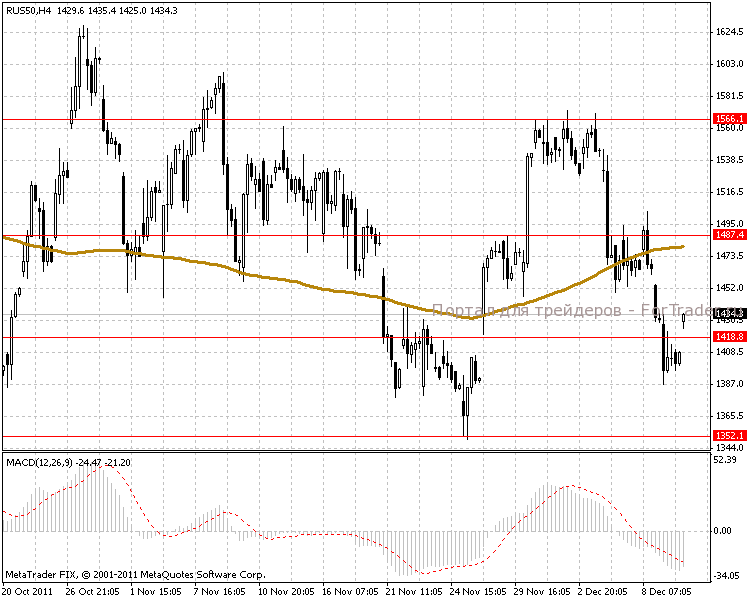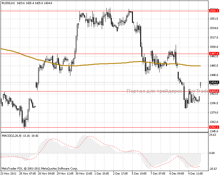 На часовом ценовом графике наблюдаем открытие торгов в канале 1487.4-1418.8 пунктов. Сегодня ожидаем интенсивное движение без значительных колебаний и вероятнее всего произойдет пробой линии сопротивления 1487.4 пунктов уже к средине дня.