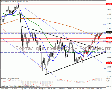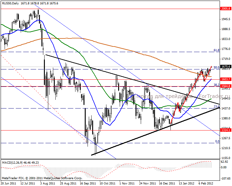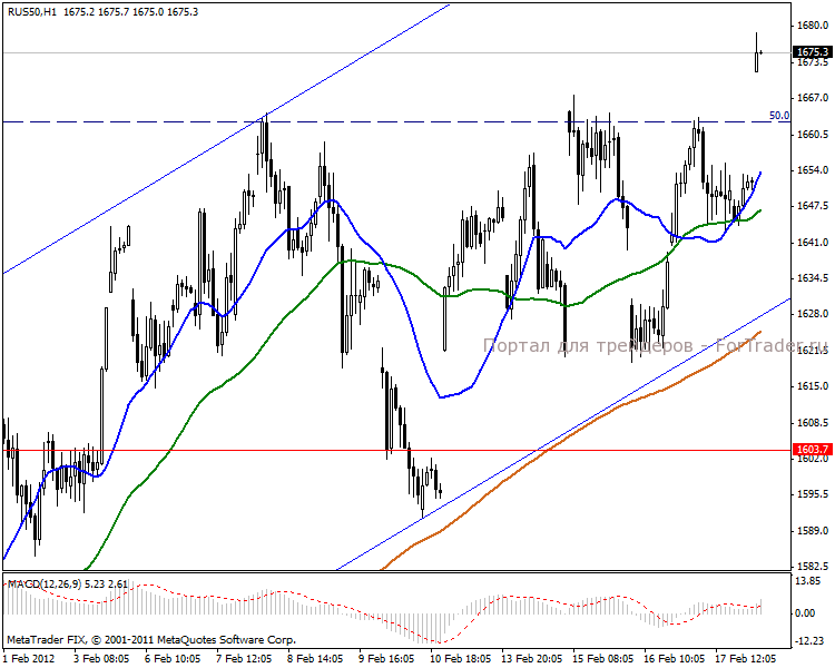 Часовой период показывает движение в средине восходящего канала. Был пробит важный уровень сопротивления 50% Фибоначчи в 1662 пункта. Сегодня, вероятнее всего, произойдет незначительная коррекция на 10-15 пунктов, но дальнейшее движение ожидаем в повышательной тенденции. Краткосрочные цели 1690-1700 пунктов. Индикатор MACD входит в положительную зону и наращивает укрепление.