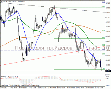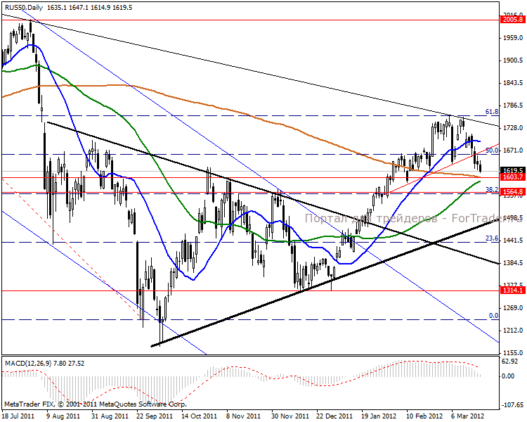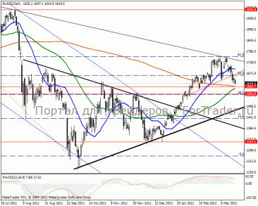 На дневном графике среднесрочная перспектива в отметке 1564 пункта. MACD сигнализирует о продажах.
