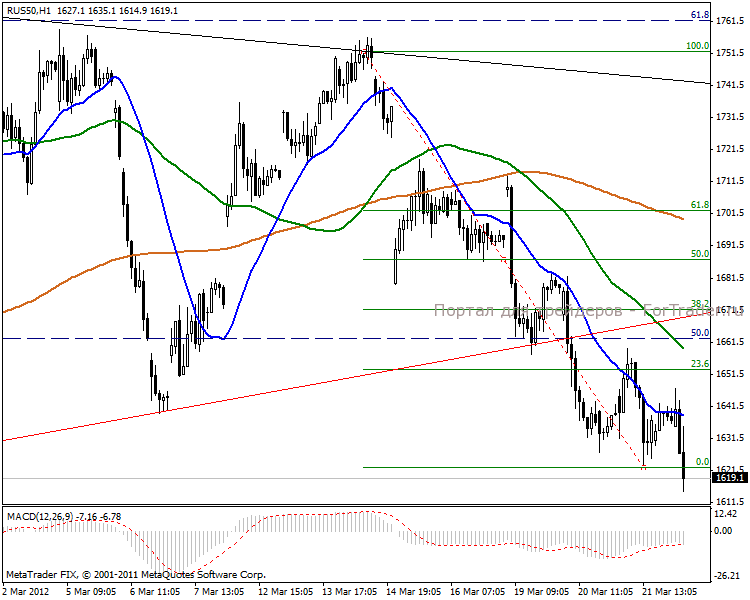 Часовой график показывает локальный нисходящий тренд, который говорит о развороте тенденции. В данный момент идет удлиненная третья нисходящая волна, после чего ждем коррекцию к 38.2% уровню Фибоначчи в отметке 1670 пунктов. В краткосрочной перспективе после коррекции начертим короткую пятерку к линии поддержки в 1603 пункта.