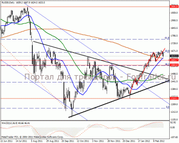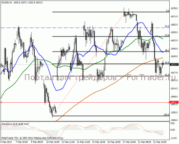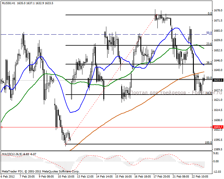Часовой ценовой график показывает глубокую коррекцию к 61.8% уровня Фибоначчи, протестировав отметку 1625 пунктов. Вероятнее всего произошел отскок от глубокого коррекционного уровня и растущая тенденция вновь заявит о себе уже сегодня, поскольку технически картина вырисовывает взятие цели 1690 пунктов.