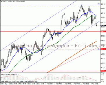 Часовой период показывает сильное коррекционное направление и подход к линии поддержки в 1603 пункта. Быстрая МА сверху вниз пересекла медленную, что говорит о завершении волны на текущем тайм фрейме. Вероятнее всего сегодня произойдет глубокая коррекция в направлении линии поддержки в область 1590-1564 пункта. MACD перешел в отрицательную зону и сигнализирует о глубокой просадке.