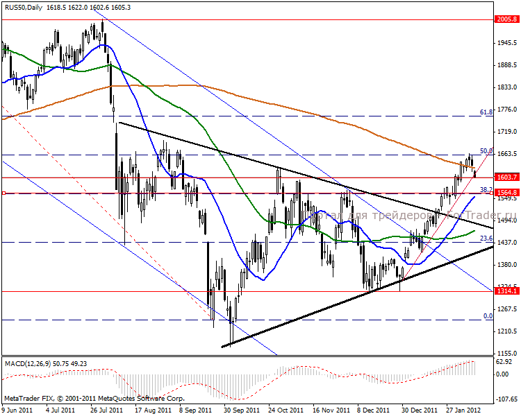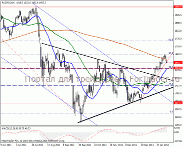 Дневной график говорит, что после просадочных действий произойдет возобновление восходящего направления к целям 1690-1700 пунктов. В случае глубокой коррекции возможна среднесрочная перспектива взятия 1760. Индикатор MACD показывает сильную повышательную тенденцию, что говорит о дальнейшем возобновлении роста индекса.