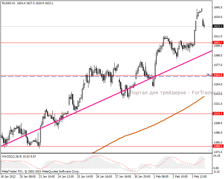 Часовой период рисует просадку к трендовой линии к 1600 пунктов. Вероятнее всего произойдет отскок в направлении основной тенденции. Есть маловероятный вариант глубокой коррекции к 1564 пункта, но фундаментальные факторы настроены позитивно, поэтому это маловероятный сценарий. Сегодня ожидаем только коррекционных направлений. MACD закрепился в положительной зоне, что указывает на растущую тенденцию в краткосрочной перспективе.
