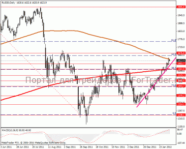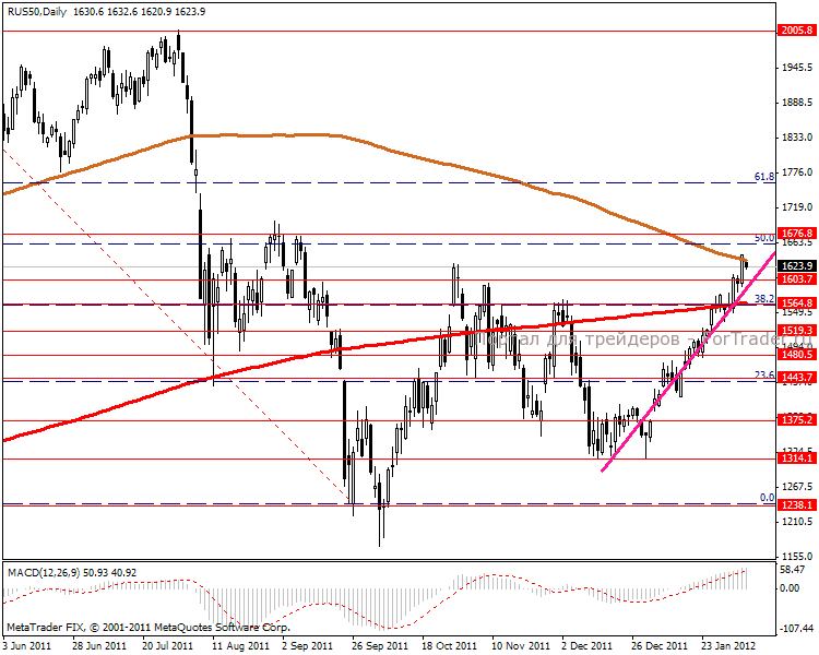 Дневной график говорит о взятии следующей цели 1660 пунктов в ближайшее время. В краткосрочной перспективе ожидаем тестирование уровня 1676 пунктов, после чего возможное формирование четвертой волны и снижение к 1564 пункта. MACD предупреждает о плавном прекращении восходящего движения.