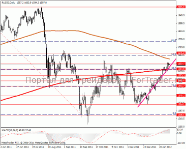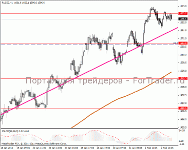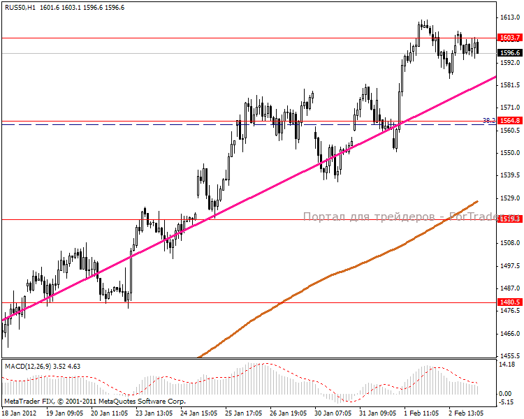 Часовой период показывает полное подчинение тренду. Сегодня вероятная просадка к 1590 пунктов, после чего произойдет возобновление движение в область заданных целей. Мы ожидаем от сегодняшнего торгового дня боковое направление в диапазоне 1590-1610 пунктов. MACD склоняет к боковику с минимальным укреплением индекса.