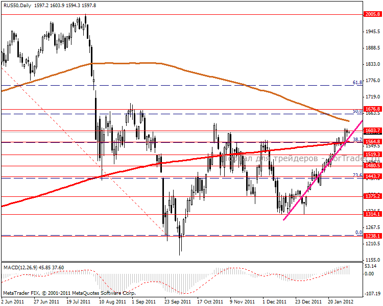 Дневной график говорит о взятии следующей цели 1660 пунктов в начале следующей торговой недели. В среднесрочной перспективе ожидаем тестирование уровня 1676 пунктов, после чего вероятнее всего произойдет коррекция и закрепление на уровне 1564 пункта. MACD демонстрирует восходящее направление.