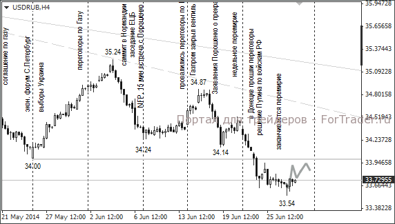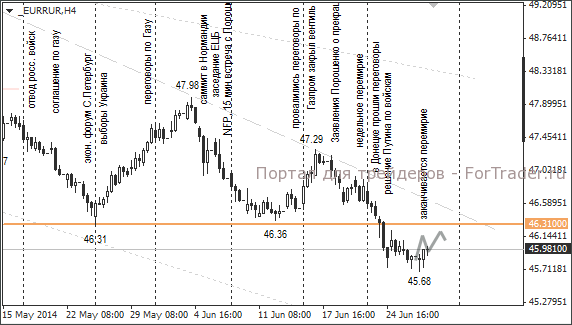 С утра поступают тревожные новости, что украинской армией в Семёновке было применено химическое оружие. Рубль адаптировался к боевым действиям на юго-востоке Украины, поэтому посмотрим, как рынок отреагирует с открытия на проведённый митинг в Киеве и просьбу лидеров ФРГ, Франции и России продлить перемирие. Поскольку в понедельник объёмы торгов на финансовых рынках понижены, то по рублёвым парам до вторника ожидается умеренный рост к 46,15 и 33,90.