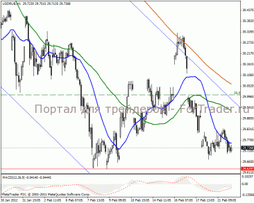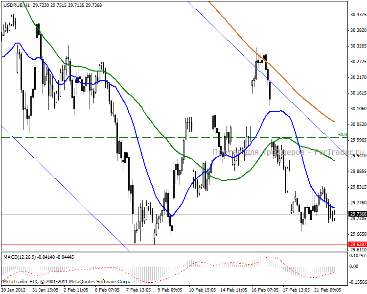 Часовой период показывает боковик в нисходящем канале. Цена привязана к сильной линии поддержки в 29.62 пункта. Сегодня есть вероятность подойти к 50% уровню Фибоначчи к 30.00 пунктам на фоне укрепляющихся российских индексов. MACD находится в позиции «зеро», что указывает на боковое направление.