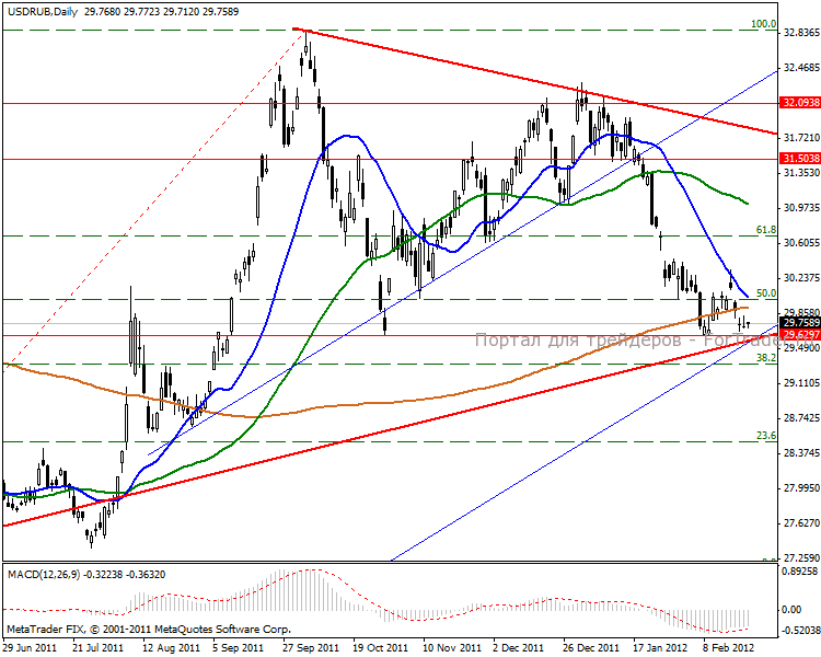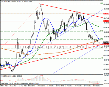 На дневном ценовом графике видим перспективу динамичного снижения российской валюты. Вероятнее всего цена повторит прошлую динамику движения и войдет в восходящий канал, повторяя рост с 28.10.2011 года. В данный момент происходит отбой от линии долгосрочного «бычьего» тренда в направлении взятия цели 61% уровня Фибоначчи 30.64 пункта. Перспектива остается восходящая к верхней границе среднесрочного тренда в диапазон 31.55-31.76 пунктов.