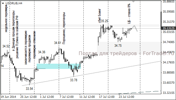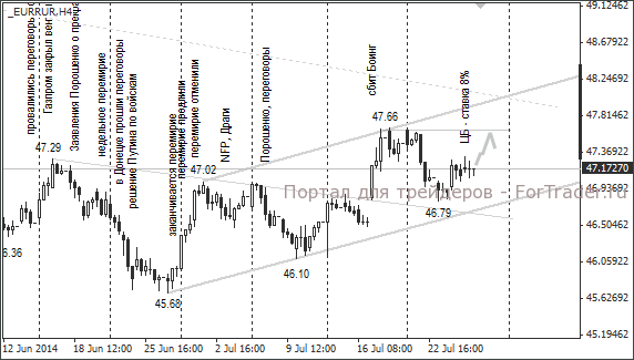 США и ЕС продолжают расширять санкции и обвинять Россию во всём, что происходит на Украине. В настоящий момент готовится следующий раунд санкций. При отсутствии укрепляющих факторов доллар и евро могут в ближайшие три дня прибавить ещё по 50-70 копеек. Курс доллара остановился около сопротивления 35,25 (максимум от 18 июля). Курс евро замедлил рост около уровня 47,66 (максимум от 18 июля). В случае успешного прохождения указанных сопротивлений курсы доллара и евро отправятся к 35,50 и 47,96. Поскольку в понедельник важных данных не выходит, на фоне коррекционного движения пары евро/доллар на валютном рынке Форекс, рубль может резко подешеветь против евро с открытия торговой сессии на Московской бирже.