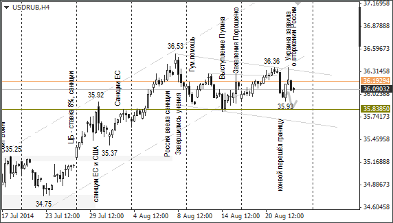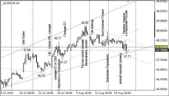 В пятницу валютный рынок открылся снижением по евро и доллару. Вскоре после открытия рубль стал терять позиции, реагируя на сообщения украинских властей, что въезд российского гуманитарного конвоя на территорию Украину является «прямым вторжением» России. Об этом заявил Глава Службы безопасности Украины (СБУ) Валентин Наливайченко. Когда в СМИ всё стихло, российские автомобили направились в Луганск. Гуманитарный конвой успешно добрался до города, разгрузился и быстро вернулся в Россию. Российские и украинские таможенники подтвердили, что гуманитарный конвой вернулся в Россию с Украины пустым.