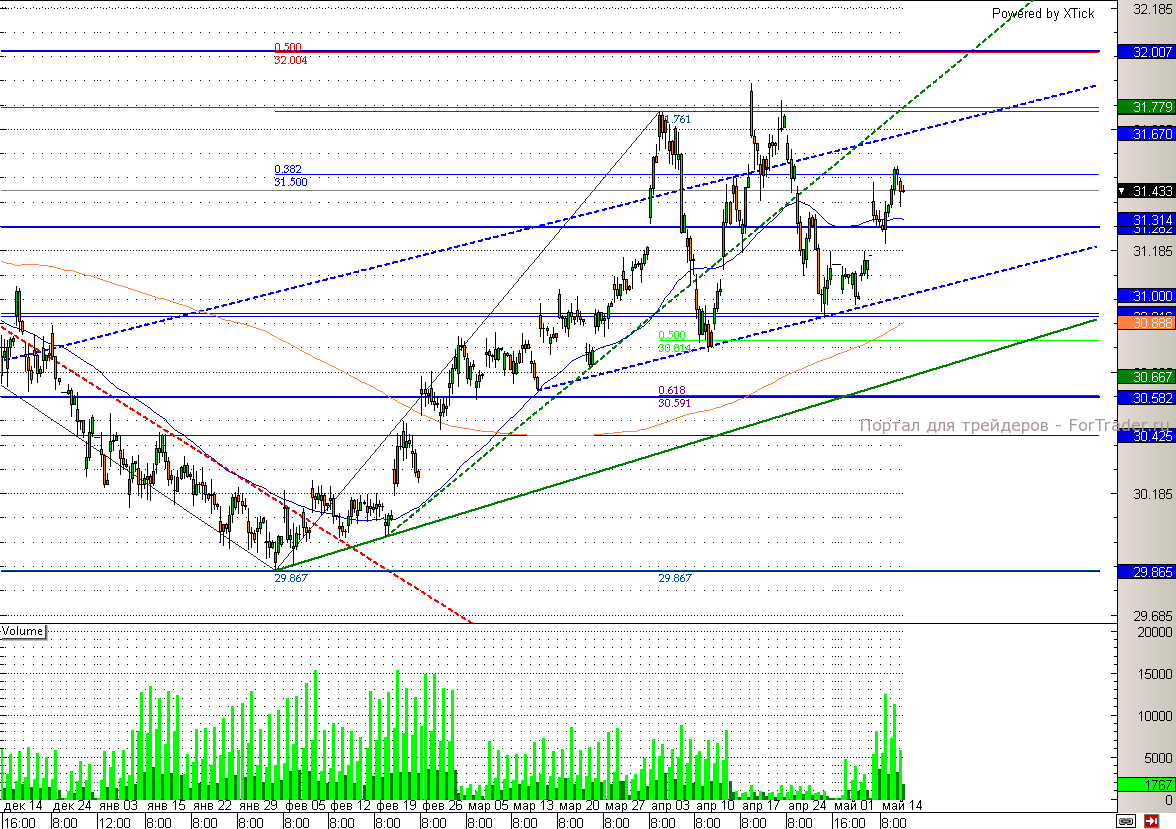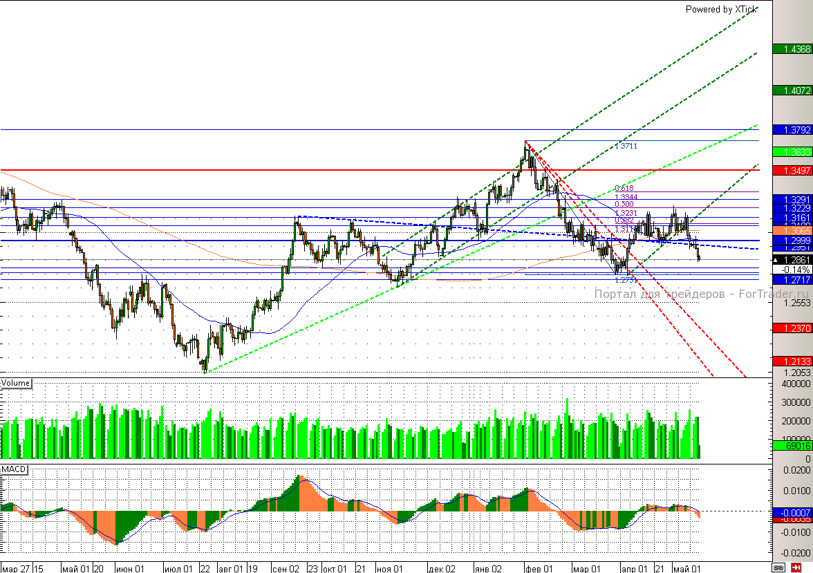 Вышедший накануне ВВП еврозоны (-0,2%) за первый квартал опустил европейскую валюту ниже 1,295 и теперь ближайшей целью стал уровень 1,28. Если и данную отметку удастся преодолеть, то евро/доллар может ждать значительное ускорение снижения. При этом драйвером для такого движения может стать как негативная статистика по региону, так и публикация протоколов ФРС, которая состоится 22 мая. Любой намек на сворачивание стимулирующих мер будет способствовать укреплению американской валюты.