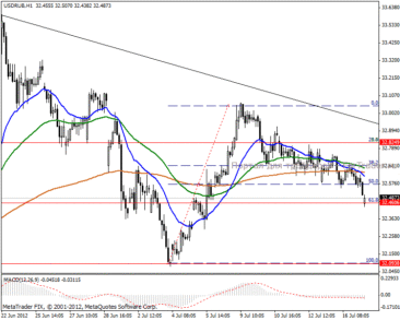 На часовом ценовом графике видим завершение коррекции локального роста пары и отскок от поддержки в 32.46 пунктов. Ввиду весомых фундаментальных факторов ожидаем укрепление российской валюты к отметке 32.09 пунктов, но технические сигналы указывают на противоположное и дальнейшее движение будет направлено к цели 32.82 пунктов. В краткосрочной перспективе рекомендуем побыть вне рынка и ждать решающих импульсов. Есть вариант войти в покупку внутридневно в случае подхода к отметке 32.66 пунктов.