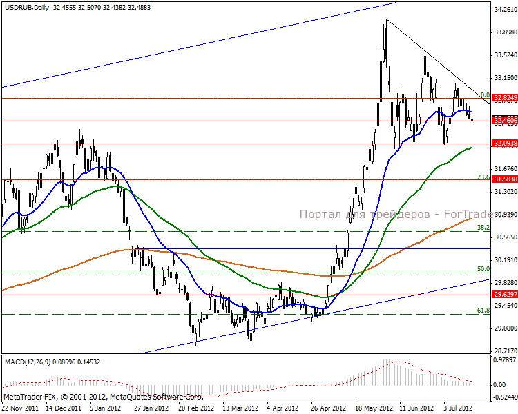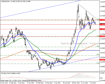 На дневном графике видим треугольник, цена отскочила от верхней границы фигуры и идет в направлении взятия отметки 32.09 пунктов. Средние ЕМА указывают на продолжение растущей тенденции и взятие локального максимума к концу августа текущего года в отметке 34.61 пунктов.