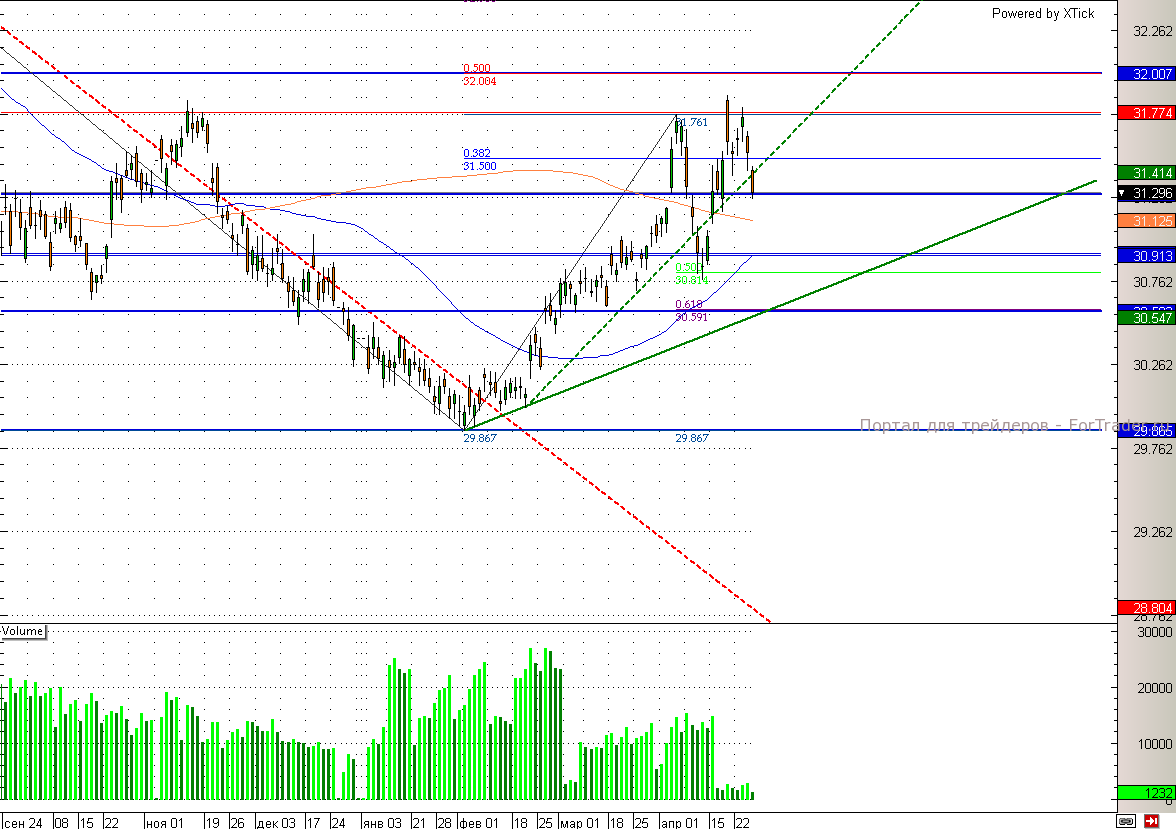 Поддержку российской валюте оказывает рост нефтяных котировок, который происходит на фоне резкого сокращения запасов бензина в США (-3,93 млн баррелей) за прошедшую неделю по данным Минэнерго. Дополнительным фактором, повышающим спрос на рубли, являются крупные налоговые выплаты, которые происходят непосредственно сегодня. При этом ЦБ продолжает свои валютные интервенции и накануне продал иностранной валюты на 2,22 млрд рублей. Благодаря такой мощной поддержке рубль смог укрепиться сегодня до 31,3. Теперь на определенное время может наступить консолидация с тенденцией к незначительному ослаблению российской валюты, ведь, те факторы, которые в недавнем времени поддерживали рубль, уже завтра могут сойти на нет. Таким образом, налоговых выплат до второй половины следующего месяца не ожидается, а ЦБ может приостановить интервенции, т.к. бивалютная корзина уже почти опустилась ниже 35,55, уровня, исключительно выше которого Банк России и начал продажи иностранной валюты.