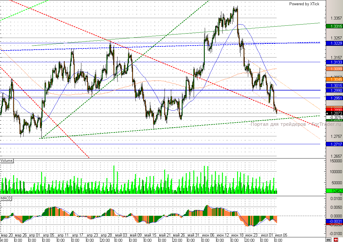 Между тем еще накануне снижение европейской валюты составило практически 1%. Виновником этой слабости стал ЕЦБ своими заявлениями о сверхмягкой денежно-кредитной политике в течение длительного времени. В свою очередь макроэкономическая статистика по еврозоне в последнее время также не внушает оптимизма. В частности финальные данные по ВВП региона за первый квартал показали уменьшение показателя на 0,3%. Поэтому покупка евро к доллару в среднесрочной перспективе связана с повышенными рисками, и производить ее следует с предельной осторожностью. Ближайшая поддержка расположена на отметке 1,285, сопротивление -1,3.