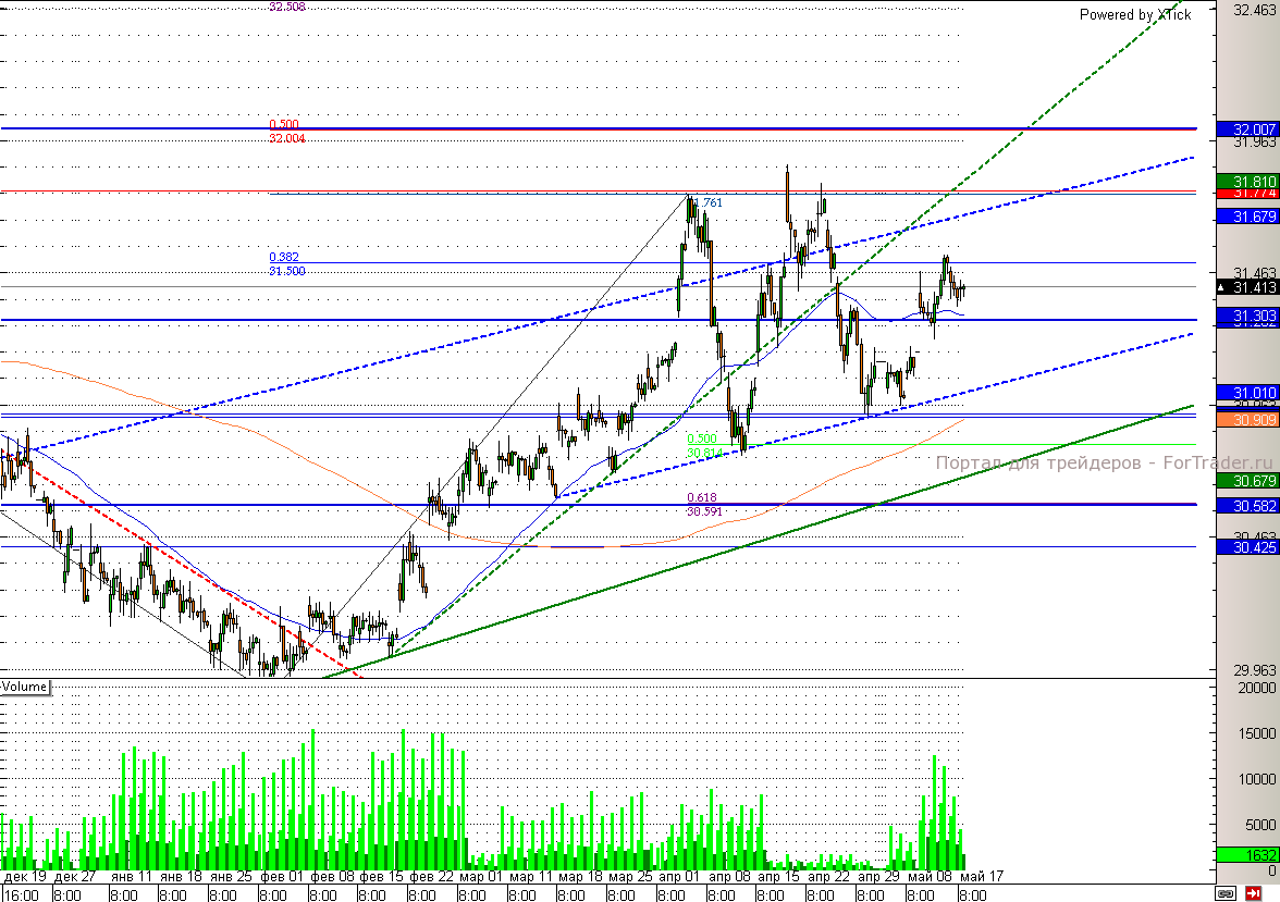 Основным драйвером для снижения выступает незначительное падение нефтяных котировок. По сорту Brent потери к текущему моменту составляют более 0,2%. При этом внутренний спрос на рубли в преддверии крупных налоговых выплат сейчас достаточно высок, о чем свидетельствуют практически максимальные значения по ставкам на межбанковском рынке. Данный фактор еще некоторое время будет поддерживать российскую валюту и может укрепить ее в район 31,3. Впрочем, на следующей неделе состоится ряд событий, которые могут помешать укреплению рубля и ослаблению доллара. В частности важным событием для доллара станет публикация протокола ФРС, которая состоится 22 мая. Если в данном протоколе подтвердятся предпосылки для сворачивания стимулирующих программ, то доллар может значительно укрепиться.