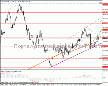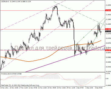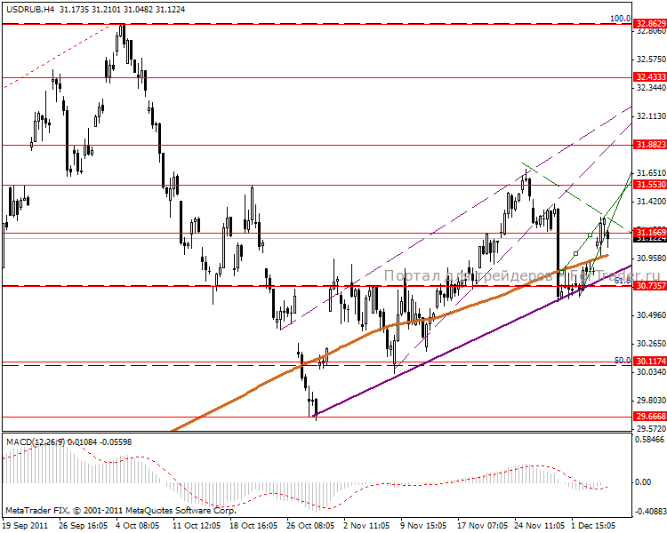 Четырех часовой ценовой график рисует красивую привязанность к трендовой линии, динамика падения российской валюты набирает стремительное движение в канал 31.16-31.55 пунктов с дальнейшим закреплением в нем. Сегодня будет небольшое укрепление рубля и движение в направлении основной тенденции.