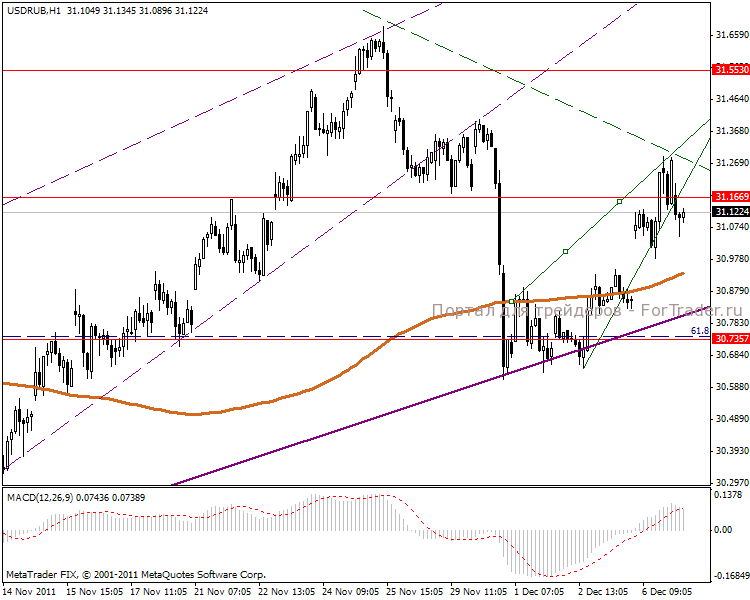 Часовой период показывает вероятность просадки к трендовой линии. Сегодня ожидаем слабую активность рынка, и движение будет не интенсивным. MACD набрал рост в положительной зоне, что говорит об укрепление доллара.