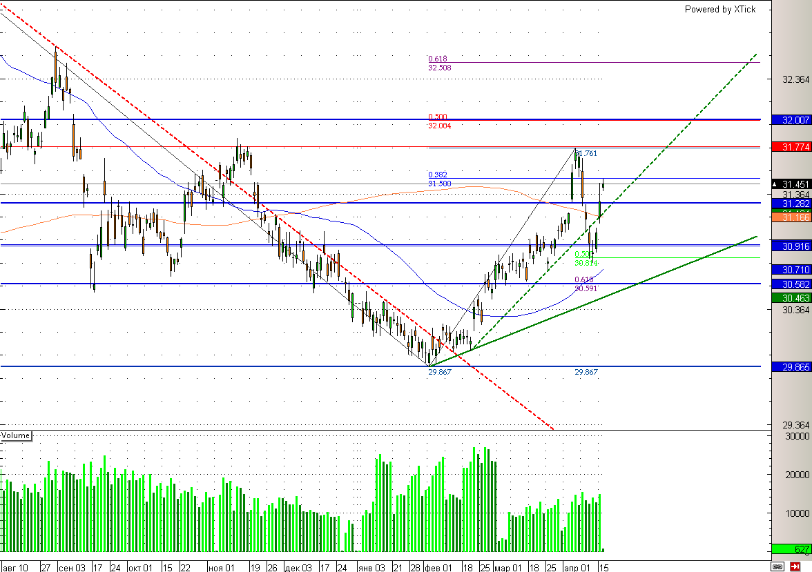 С технической точки зрения валюта в скором времени вполне может вернуться к отметке 31,3, где сейчас проходит трендовая линия. Немалую роль в возвращении может сыграть подъем «черного золота» обратно – выше 100 долларов за баррель. От 31,3 вероятно, начнут формировать позиции крупные игроки. Таким образом, пробой данного уровня может вернуть рубль в район 31, а движение по тренду предполагает рост доллара до 31,8.