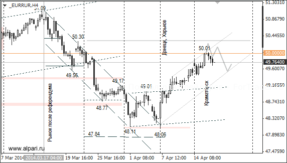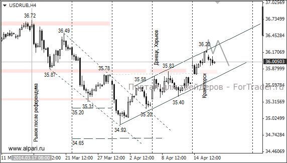 Поддержку рублю оказали растущие котировки на нефть, отсутствие негативных новостей из Украины, а также продажа экспортёрами валютной выручки. Власти Киева отправляют военных подавлять мятежи, а те отказываются применять силу в отношении местных жителей и переходят на сторону протестующих. Минобороны Украины опровергло информацию о перебежчиках, но судя по вчерашней динамике курсов доллара и евро «антитеррористическая операция» на востоке страны провалилась.