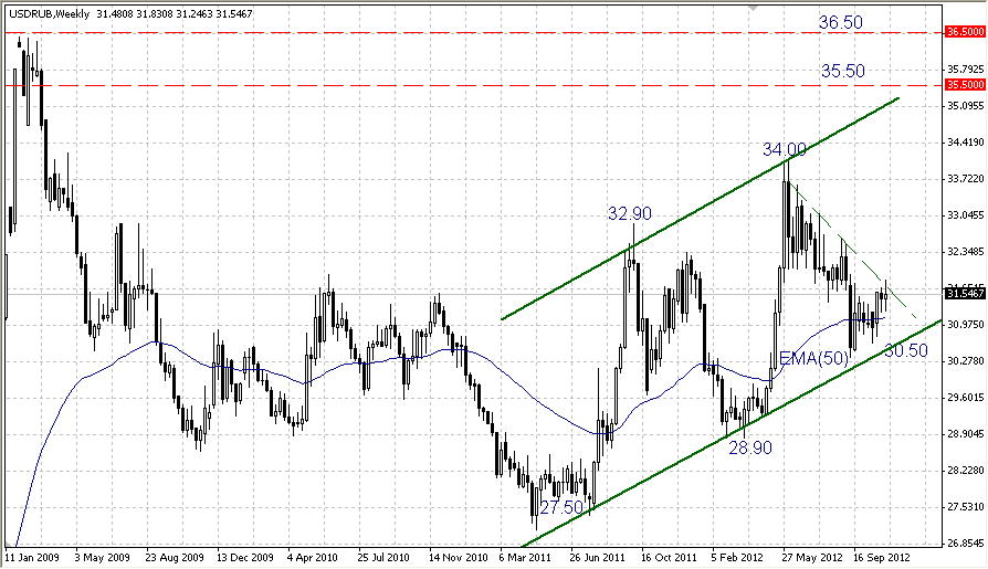 ·         За июль-октябрь 2011 года фаза роста курса USD/RUR составила 5.4 рублей (32.90-27.50), за май 2012 года – 5.1 рублей. Если брать за основу поддержку 30.50, то «повторение истории» может означать рост курса в район сопротивления 35.50 в ближайшие месяцы.