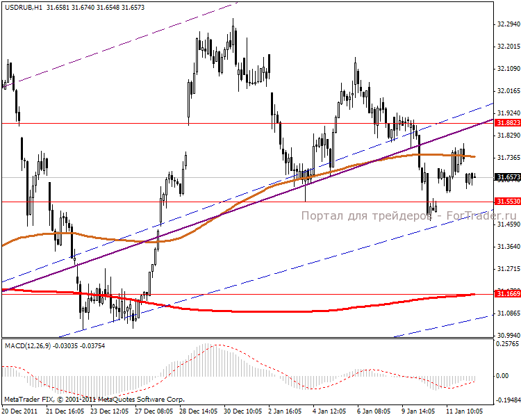 Часовой период показывает движение в диапазоне 31.88-31.55 пунктов. Сегодня ожидаем нисходящее слабое, даже боковое направление, привязанное к сильной линии поддержки. Однако не стоит забывать и о силе «бычьего» тренда, который в любую минуту может заявить о себе. MACD склоняет к боковику.