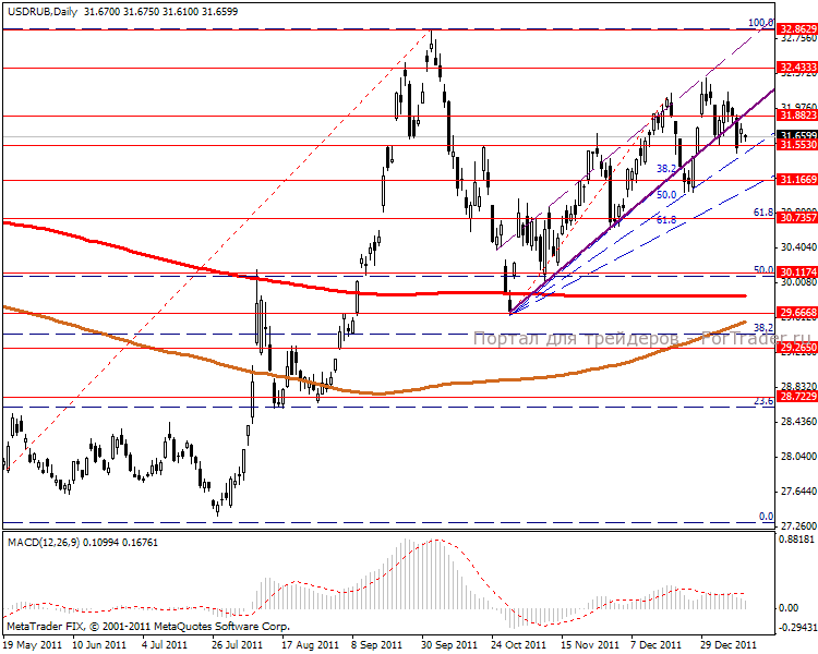 Дневной график рисует дальнейшее движение в верхнем канале веера Фибоначчи. Цель остаются прежние в 32.43 пункта. Глубоких просадок не ожидаем, с уверенностью можно входить в лонг. Среднесрочная перспектива 32.86 пунктов. MACD находится в положительной зоне и говорит о преобладании растущей тенденции.