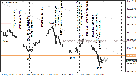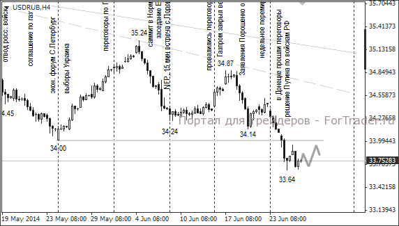 Слабый ВВП – не трагедия для доллара, так как уже завершается II квартал. Влияние на рубль по-прежнему будет оказывать ситуация на Украине и налоговый период в РФ. Рублёвые пары до понедельника могут простоять в диапазоне 35-45 копеек от своих минимумов.