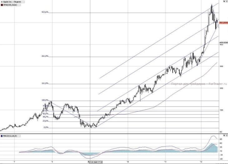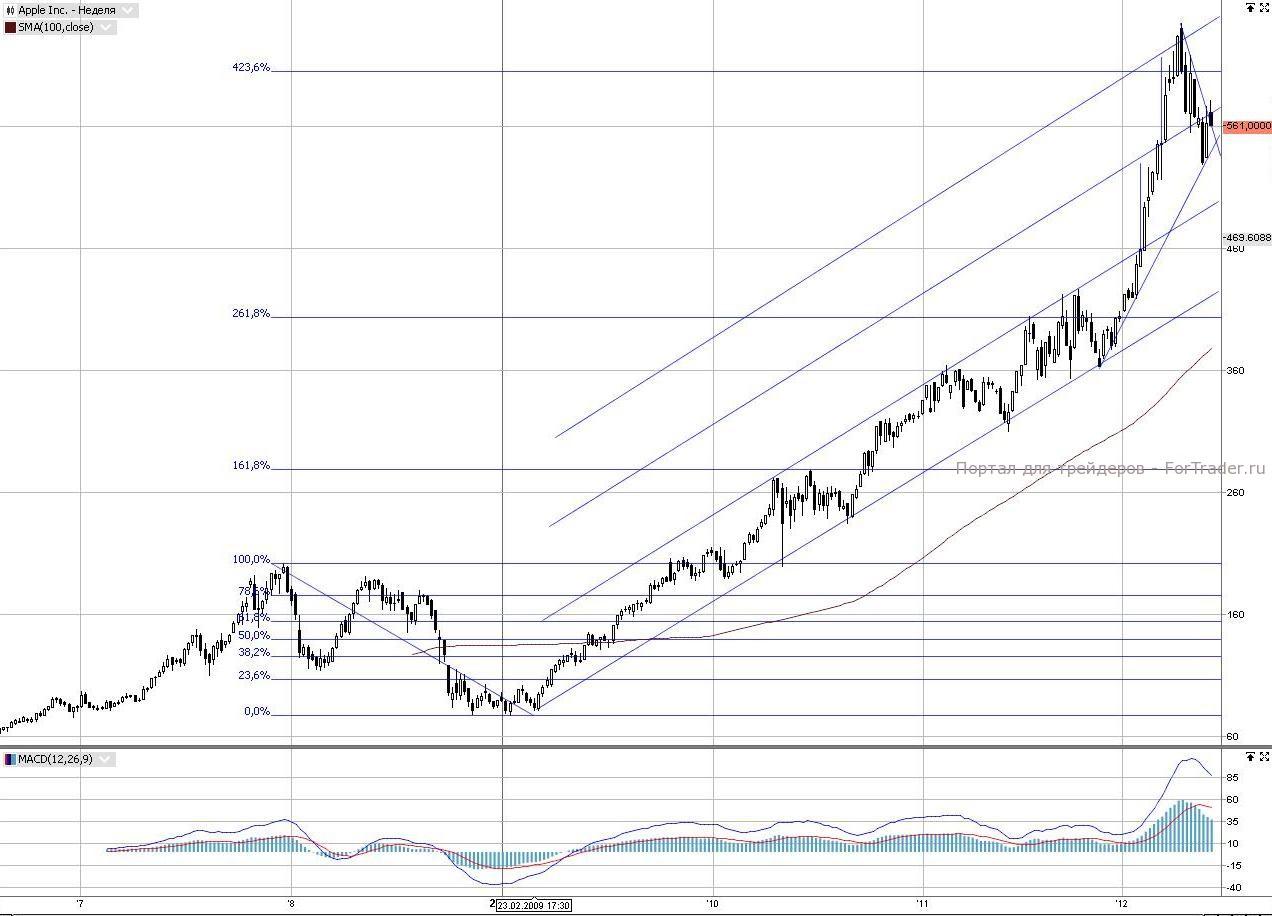 График Apple уникален даже для зарубежных рынков. Он поражает силой поддержек ныне действующих восходящих трендов. И это тренды не только 2009 года…