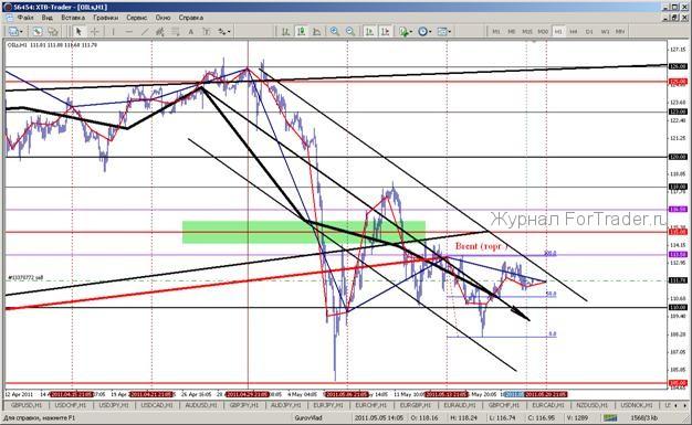 Котировки нефтяного рынка, контракты на смесь Brent, находятся в тенденции снижения, после того, как средний уровень недельных сделок не закрепился выше уровня 125 долларов за баррель в период торгов последней недели апреля. Область уровня 110 долларов может рассматриваться в качестве верхней ценовой области, относительно, «справедливого» диапазона стоимости эталонной смеси нефти, где уровень 100 долларов может рассматриваться «базовым» уровнем. Направление тенденции нефтяных котировок эталонной марки в область уровней 103-107 долларов за баррель. Текущий диапазон в области уровней 110,75-111,75.