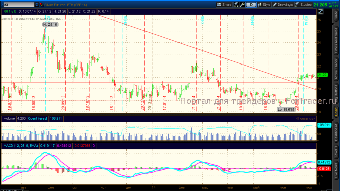 Рынок серебра подрастал в зоне текущей консолидации и преодолел уровень сопротивления 21,25$. Продолжение роста возможно до уровня 22$ при условии роста цен на рынке золота.