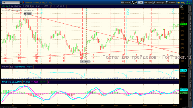 Рынок платины вырос до уровня 1517$, реагируя на рост стоимости золота и снижение курса доллара США. Возможно продолжение роста до уровня 1550$.