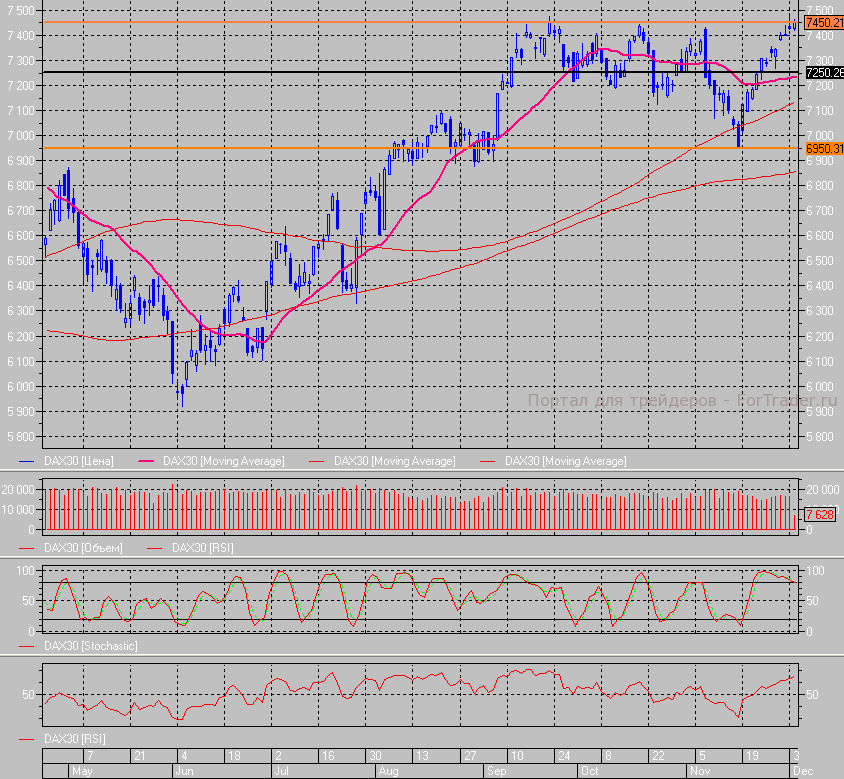Немецкий индекс DAX постепенно растет в течение дня и с уровня 7440 он смог вырасти до 7465 пунктов, после чего консолидируется в диапазоне 7450-7460.