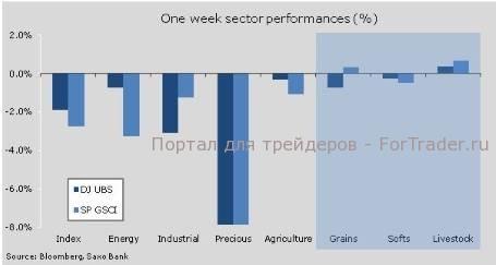 Индекс UBS-Dow Jones, в который инвестированы миллиарды долларов, понизился на 14% по сравнению с максимальным значением, установленным в сентябре прошлого года. Нисходящее движение усилилось в апреле, когда стали выходить неутешительные экономические данные, а перспектива высокого урожая предстоящим летом ликвидировала поддерживающий фактор цен на ключевые сельскохозяйственные культуры.