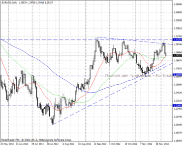 Вчера глава ЕЦБ на пресс-конференции озвучил прогноз, в котором экономика еврозоны по итогам 2012 года сократится на 0.4-0.6%, а 2013 году в случае негативного сценария падение показателя может составить 0.9%. Однако если же восстановление еврозоны будет более стабильным, ВВП региона вырастет на 0.3%. По прогнозу ЕЦБ уровень инфляции в текущем году будет сохраняться выше 2%, а так же большая вероятность того, что слабость экономики будет сохраняться на протяжении всего следующего года. Добавим, что по итогам прошлого заседания Европейский Центробанк оставил базовую процентную ставку на уровне 0.75% годовых. Ставка ЕЦБ по маржинальным кредитам сохранена на уровне 1.5%, а по депозитам 0%.