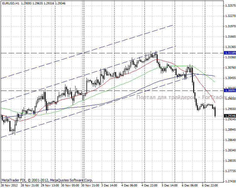 Внутридневная торговля резко изменила свою тенденцию, была пробита нижняя граница восходящего канала. Уже все линии скользящих средних направлены вниз и пробит уровень сильной поддержки 1,2950.