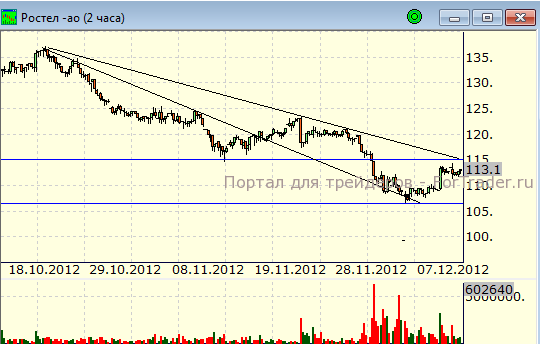 Нащупав поддержку в районе отметки 107 рублей, цены оформили отскок вверх. В настоящее время котировки поднялись к локальному уровню сопротивления — отметке 115 рублей, который в этом качестве усилен линией предложения октябрьского нисходящего тренда. Таким образом, покупателям будет сложно сломить текущую тенденцию с первого захода, что поведет за собой новый откат в рамках диапазона 115-107 рублей.