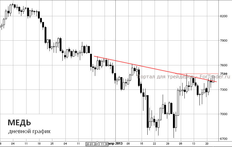 Техническая картина сейчас нейтральная, идет тест «на прочность» ключевого сопротивления, после пробития которого можно будет говорить об окончательном формировании разворотной модели. Более того, для начала покупок стоит дождаться подтверждающего сигнала — закрытия выше отметки $7500 за тонну.