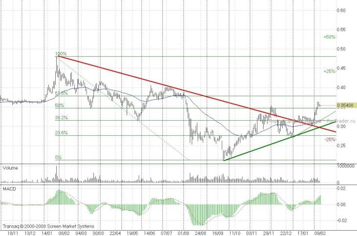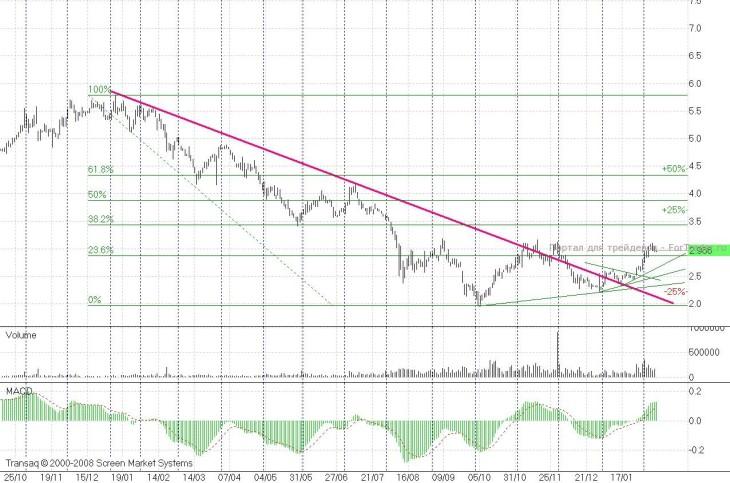 Акции «ХолМРСК» взяли сопротивление 2,55 и отправились к уровню 2,88-2,9 рубля (некоторые спекулянты зафиксировали здесь прибыль). Но рубеж 2,88-2,9 рубля сопротивлялся не больше трех дней. Теперь он стал поддержкой и для бумаг актуально новое сопротивление — 3,43 рубля. Может быть, бумаги локально перекуплены, но я вижу под ними два восходящих тренда от середины декабря 2011 года и от середины января 2012 года, что весьма позитивно.