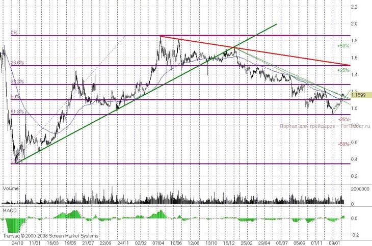 В бумагах «РусГидро» сыграна представленная ранее мной на дневных графиках игра. Бумаги избавились от сопротивления трех нисходящих трендов 2011 года и медленной скользящей средней (ЕМА 100). При сохранении акциями уровня 1,145-1,13 рубля, целью их может стать отметка 1,3 рубля. Но чудес и резких взлетов ждать не надо — над бумагами висит нисходящий тренд от апреля 2010 года.
