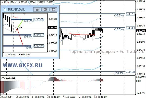 Пара GBPUSD снижалась на негативных данных по Великобритании и исполнила сделку по рекомендации. Две цели были достигнуты, однако слабый отчет ADP по новым рабочим местам в частном секторе США не позволил продолжить снижение паре. При достижении первой цели стоп можно было перенести на уровень безубытка. На этой неделе по традиции рассматриваю два варианта возможного движения цены, основной красный и альтернативный зеленый. Значимые уровни на сегодня отмечены на часовом графике. Индикатор АО находится у нуля, указывая на неопределенность. Индикатор тренда указывает на снижение. Преодоление 1,6250 позволит войти в продажи с целями 1,6220, 1,6200 и 1,6165.