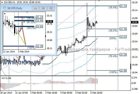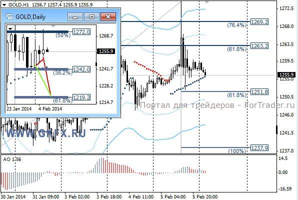 Цены на золото оставались выше 1250,0, и на американских торгах был резкий выпад вверх вплоть до 1274,3. Это, по всей видимости, был стратегический захват ликвидности для последующего возможного снижения цен. Контрольная точка 1252,0, прохождение которой укажет на дальнейшее снижение золота к минимумам недели и возможно еще ниже. Такой вариант развития ситуации возможен при хороших данных по рынку труда в США, которые ожидаются завтра. Хотя возможно и сегодня движение начнет свое начало на ожиданиях сильных данных. Традиционно делаю два варианта движения цены на неделю, основной красный и альтернативный зеленый. Значимые уровни на сегодня отмечены на часовом графике. Индикатор АО находится в положительной зоне и снижается, указывая на коррекцию перед возможным продолжением роста. Индикатор тренда указывает на рост. Преодоление 1248,0 позволит войти в продажи с целями 1242,0, 1238,0 и 1228,0.