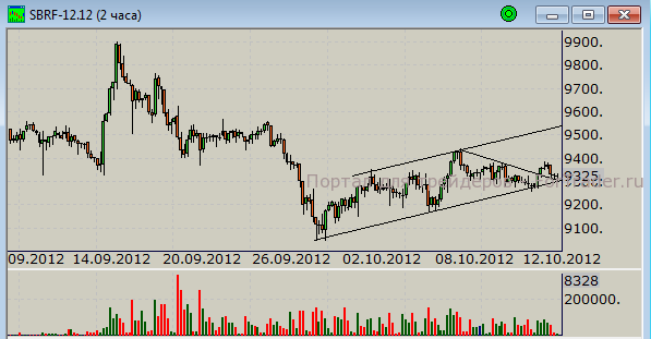 Фьючерс на акции «Сбербанка» рассмотрим подробнее. Ниже представлен двухчасовой график котировок по состоянию на закрытие 11 октября.