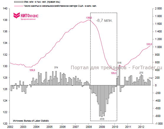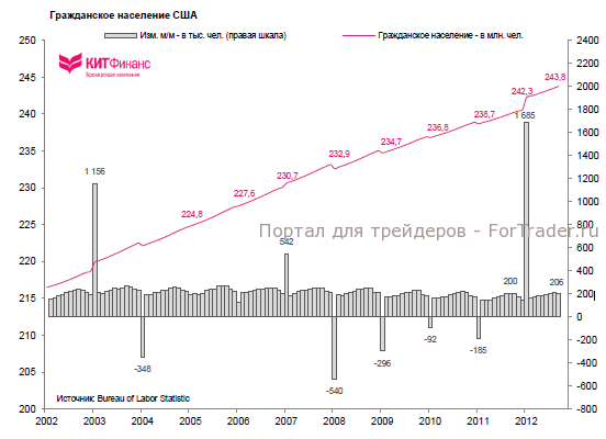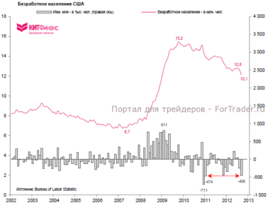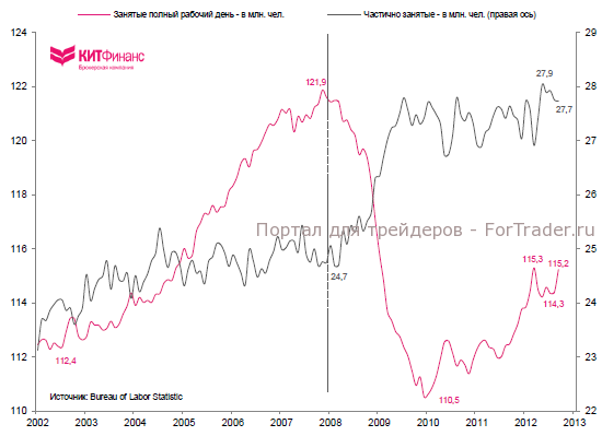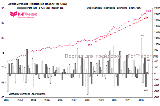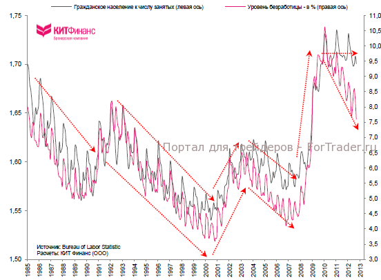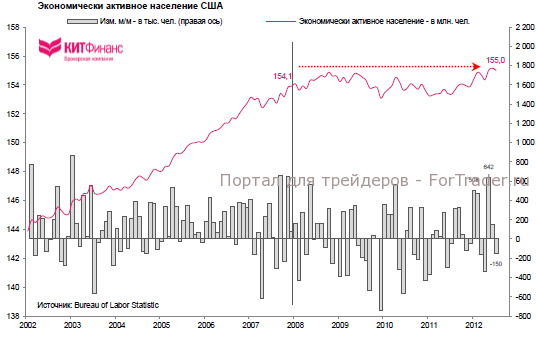 Тем не менее, если увеличение числа рабочих мест продолжится темпами 2010-2012 гг. – в среднем на 152 тыс. в мес. – то вернуться к уровням начала 2008 г. американский рынок труда сможет через 1,8 года. В 2008/09 гг. Соединенные Штаты теряли ежемесячно в среднем 171 тыс. рабочих мест. С точки зрения этих “простых” расчетов, все выглядит не так плохо — американский рынок труда постепенно восполняет кризисные потери… если не учитывать фактор прироста населения и “особенностей” статистического учета занятого населения и безработных.